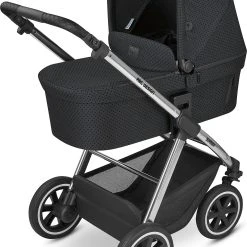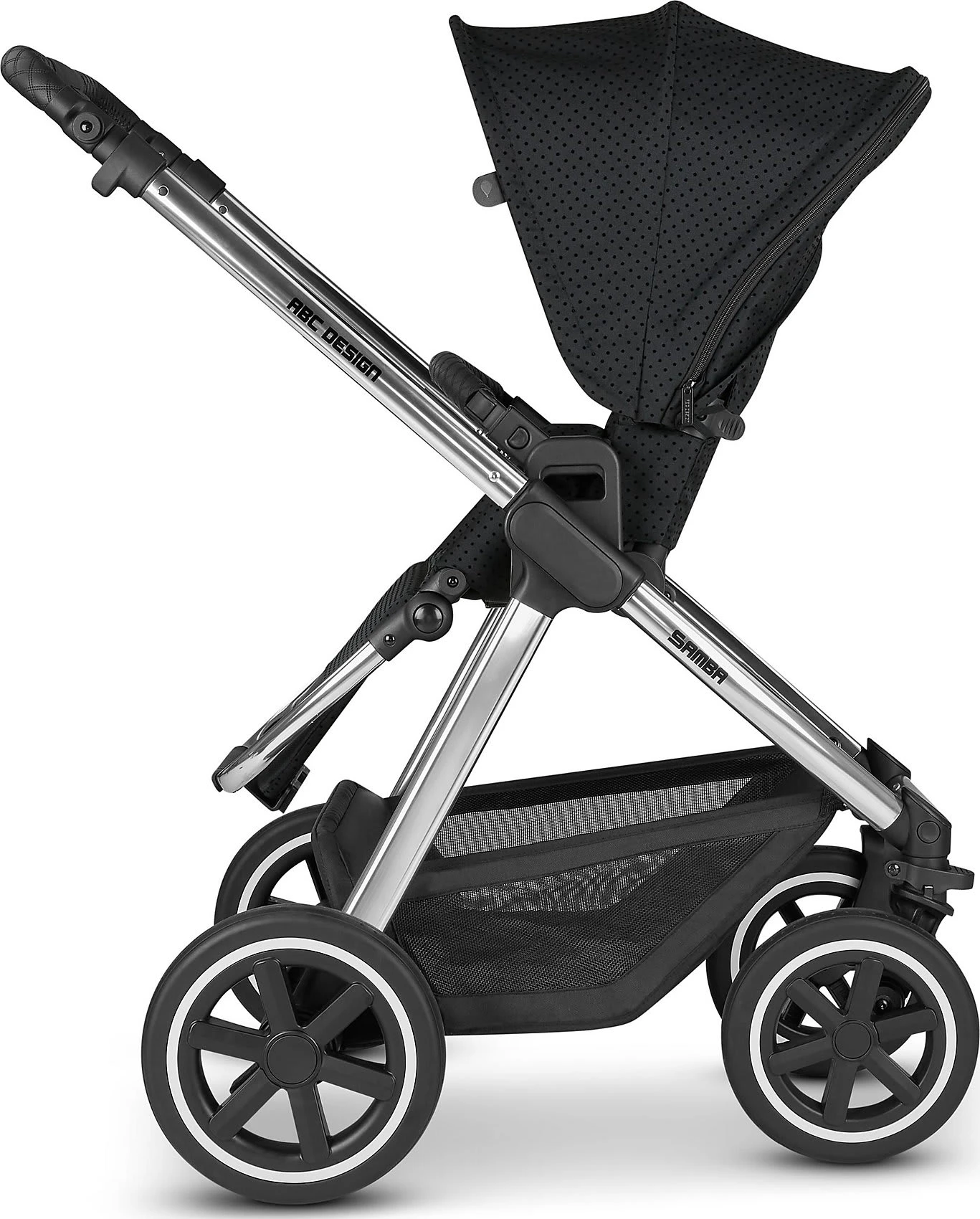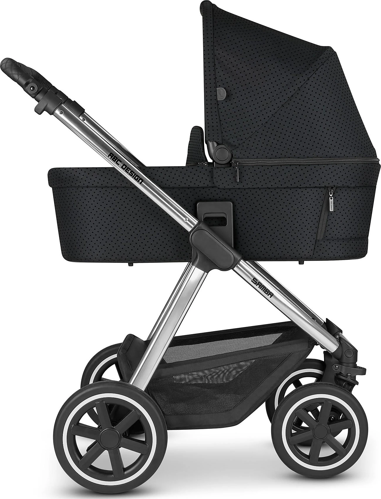 Dank der integrierten ABC Design Universal Fix Halterung finden auch Wickeltasche, Becherhalter oder Licht mit einem Klick ihren Platz am Kinderwagen. Die Bremse befindet sich direkt am rechten Hinterrad, so dass der Wagen ohne Hinterachse auskommt. Dadurch haben Eltern beim Schieben besonders viel Beinfreiheit. Der Wagen lässt sich dank der Schwenkräder leicht lenken und meistert die verschiedensten Untergründe. Die Schieberhöhe ist ebenfalls variabel, so dass ein rückenfreundliches Schieben für unterschiedlich große Personen kein Problem ist.