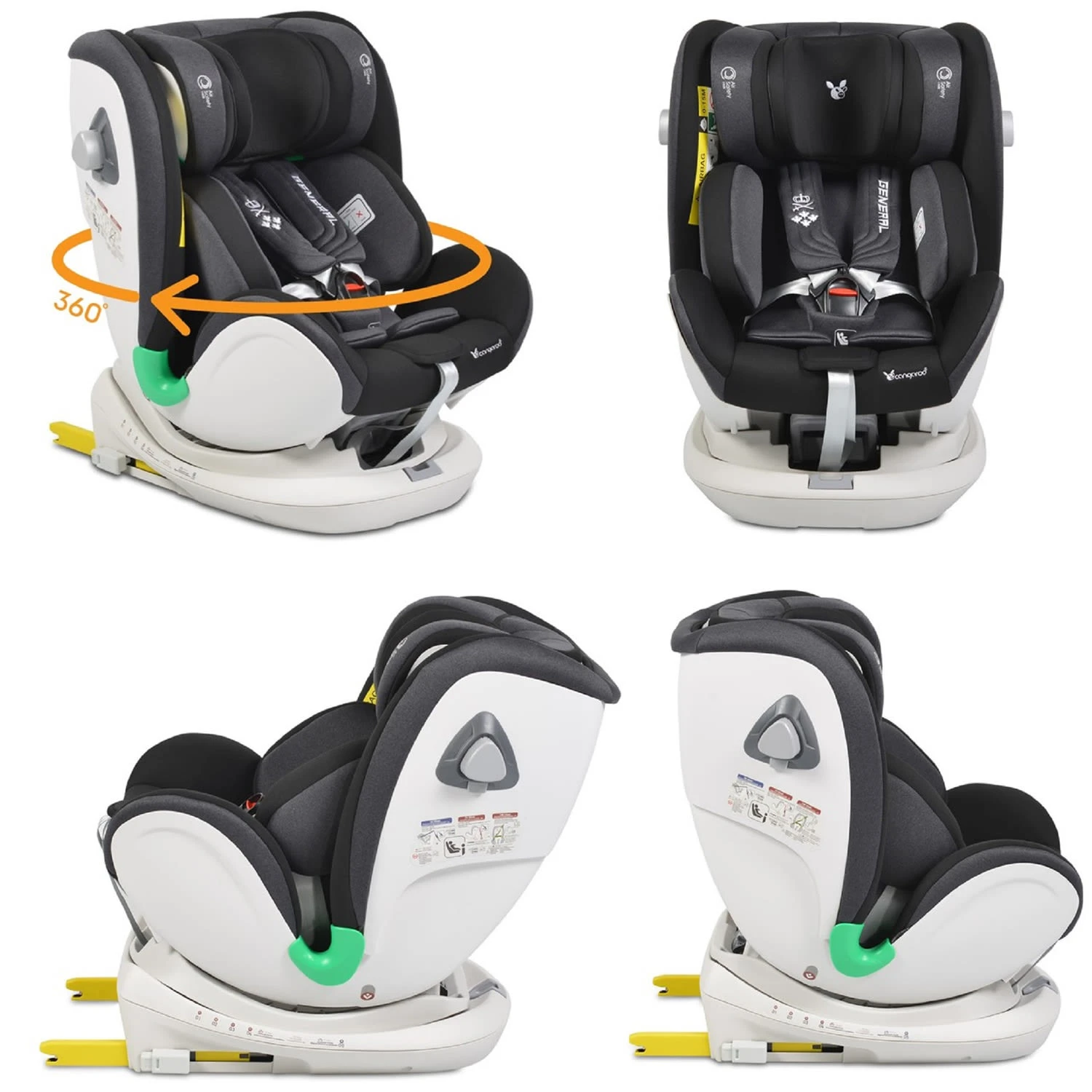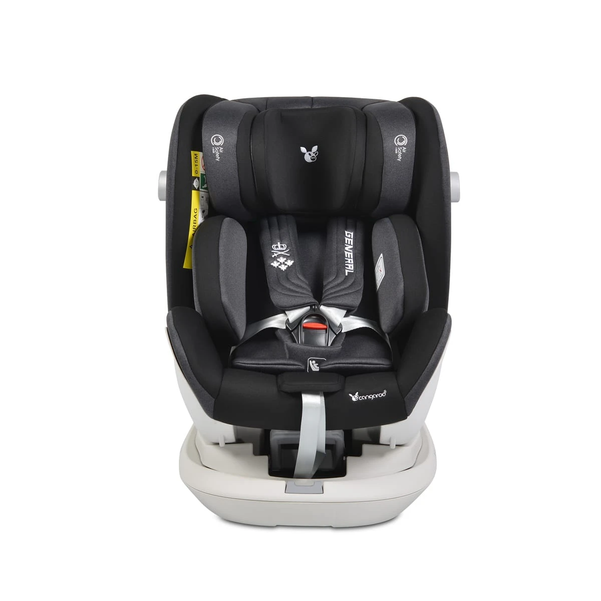 Kinder ab Geburt bis maximal 36 Kilogramm reisen ab sofort bequem und sicher im Auto mit. Der Autositz General von Cangaroo wird mit dem Isofix-System und dem Top- Tether (Gurt) im Fahrzeug gesichert. Das zusätzliche Seitenschutzsystem sorgt für extra Sicherheit während der Fahrt. Die Kopfstütze ist in zehnfach verstellbar und bietet Ihrem Kind optimalen Fahrkomfort. Die Rückenlehne verfügt über drei Neigungspositionen, die mit einer Hand eingestellt werden können. Die Basis des Kindersitzes ist um 360° drehbar. So fährt Ihr Kind bis zu einer Körpergröße von 105 Zentimetern sicher entgegen der Fahrtrichtung (Reboard) im Auto mit.