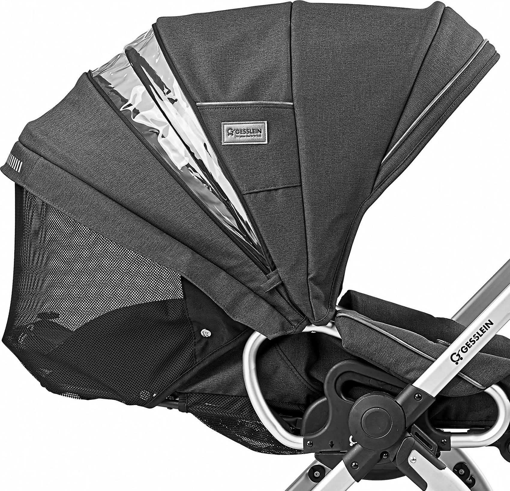 Je nach Stimmung kann auch die Blickrichtung der Sitzeinheit angepasst werden. Das abnehmbare Verdeck schützt vor direkter Sonneneinstrahlung. Dank des Fenster mit Netzeinsatz ist für eine angenehme Belüftung gesorgt.