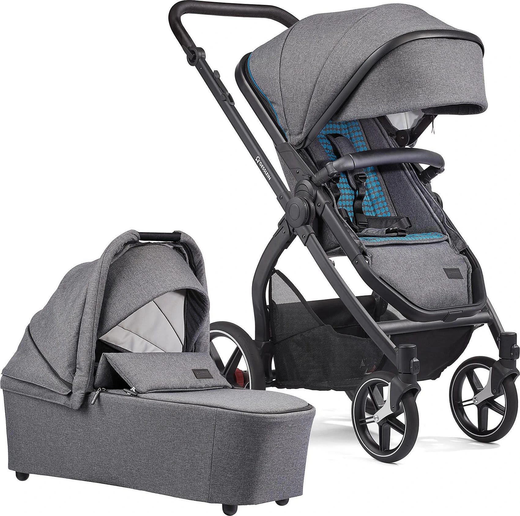 Egal ob gemütlich im Schlafmodus oder sitzend die Welt entdecken. Die Kinderwagen-Kombination von GESSLEIN macht beides möglich. Die Babywanne lässt sich ganz nach Bedarf anbringen oder abnehmen und verfügt über eine angenehme Polsterung. Bei besonders ungemütlichem Wetter kann ein zusätzlicher Windschutz hochgeklappt werden, so dass sich das Baby jederzeit wohl fühlt.