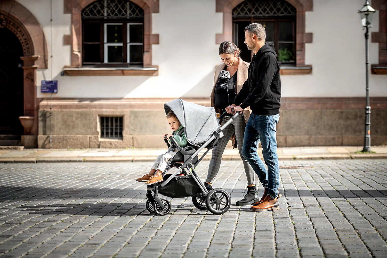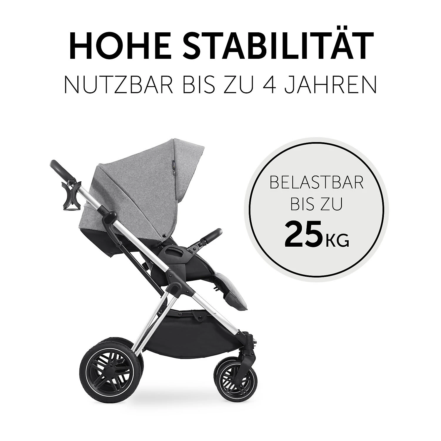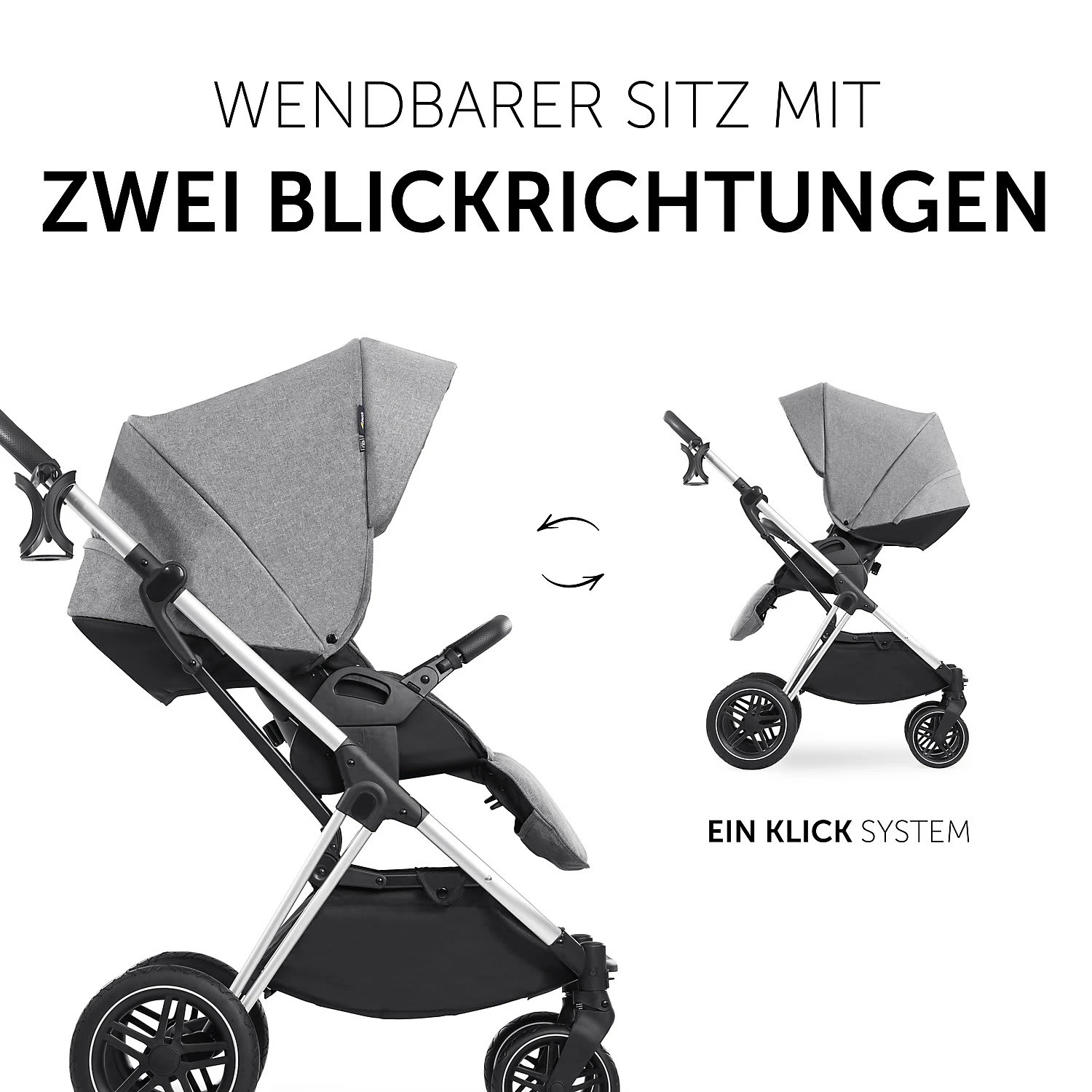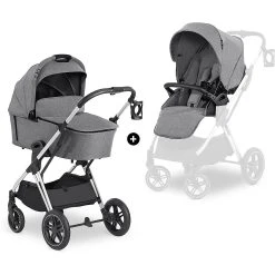 Die Befestigung beider Aufsätze auf dem Gestell geht ganz schnell mit nur einem Klick. Auch eine Babyschale lässt sich bei Bedarf an dem Gestell befestigen. Angenehm für die Eltern ist der Becherhalter am Gestell, in dem der Kaffee stets in Reichweite ist. Außerdem passt sich die Schieberhöhe an die Größe der jeweils schiebenden Person an. Schwenkbare, feststellbare Vorderräder und All-Terrain-Räder ermöglichen auf jedem Untergrund eine erschütterungsarme und komfortable Fahrt.