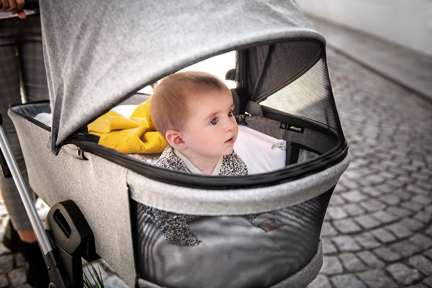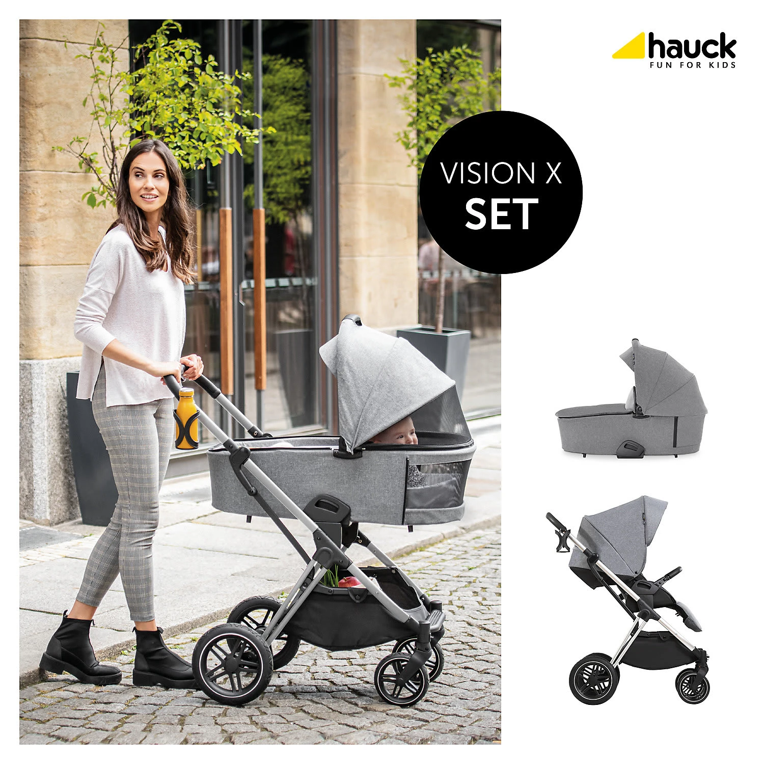 Das 2in1 Kombi Kinderwagen Set Vision X von hauck begleitet Familien ab der Geburt und ist für lange Zeit ein flexibler Begleiter. Anfangs haben es Babys im Kinderwagenaufsatz auf der atmungsaktiven Matratze sehr bequem. Das große Verdeck ist mit einem UV-Schutz ausgestattet. Zusätzlich ermöglichen zwei Mesh-Sichtfenster eine optimale Belüftung. Babys können außerdem in Bauchlage im Kinderwagen liegen und durch das in den Aufsatz integrierte Fenster ihre Umgebung beobachten.