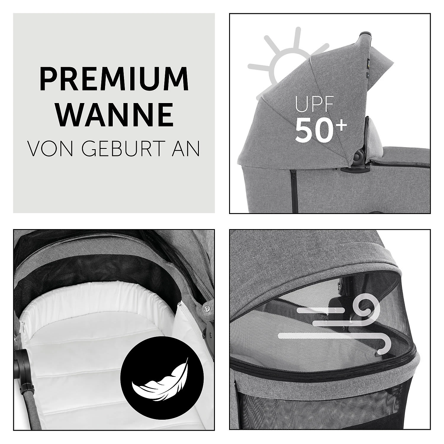 – abnehmbares Verdeck mit Sonnenblende und UV-Schutz 50+