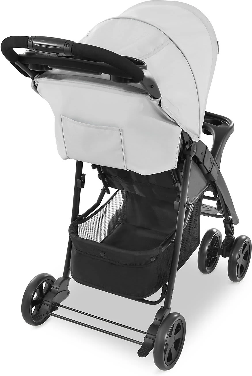 Das Babyfläschchen, Erfrischungen und Kleinigkeiten sind dabei in den beiden Ablagevorrichtungen griffbereit. Ihre Einkäufe oder Babyutensilien können Sie im großen Korb verstauen. Die Rückenlehne lässt sich per Einhandbedienung stufenweise bis in Liegeposition bringen. Die Fußstütze ist ebenfalls mehrfach verstellbar.
