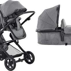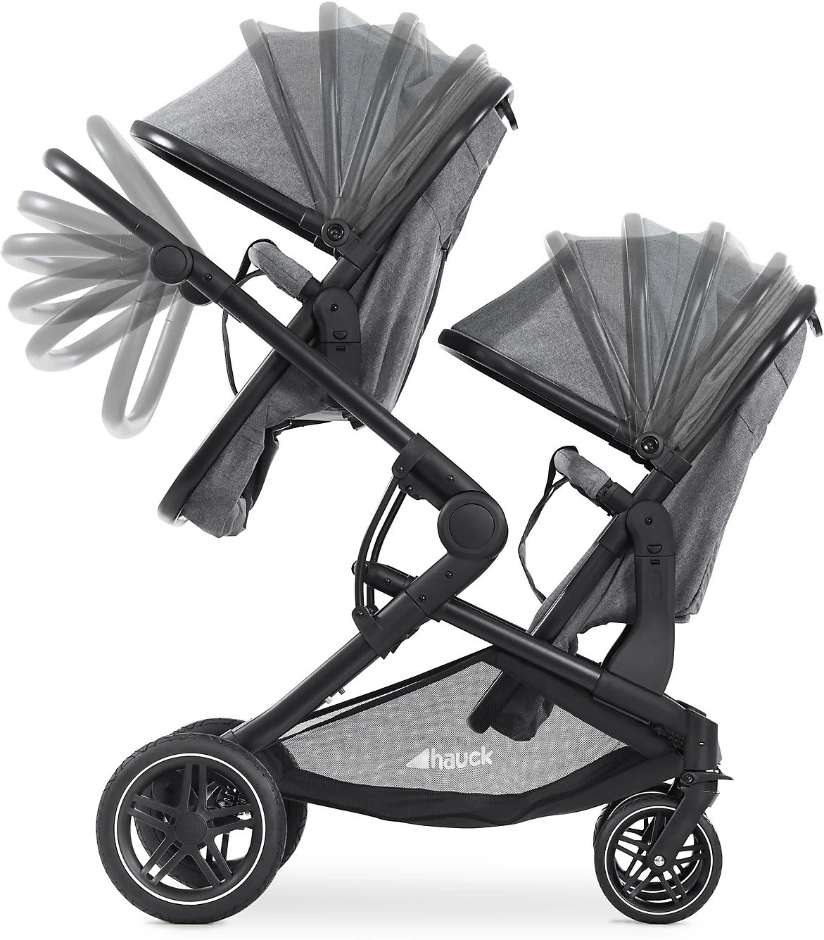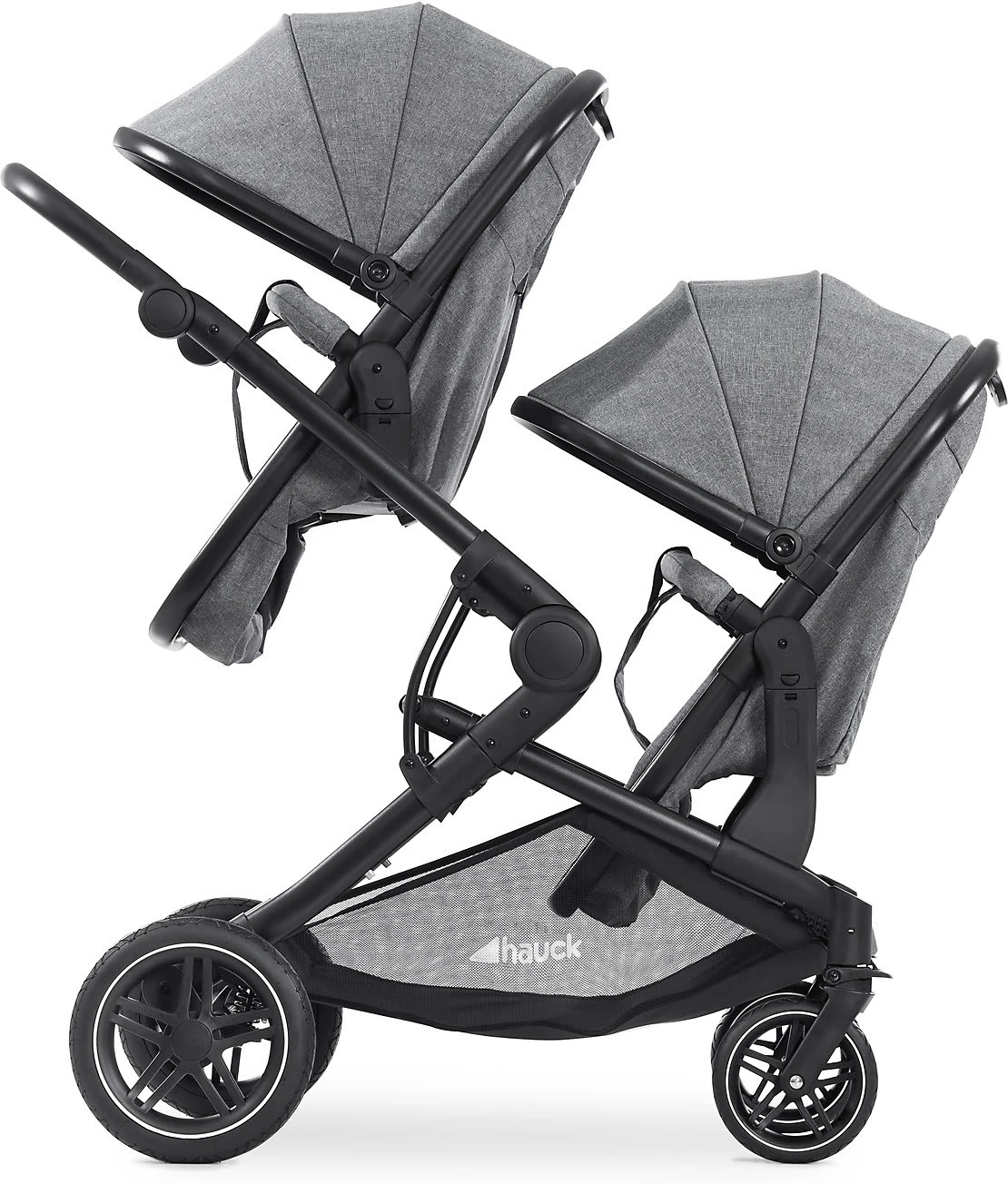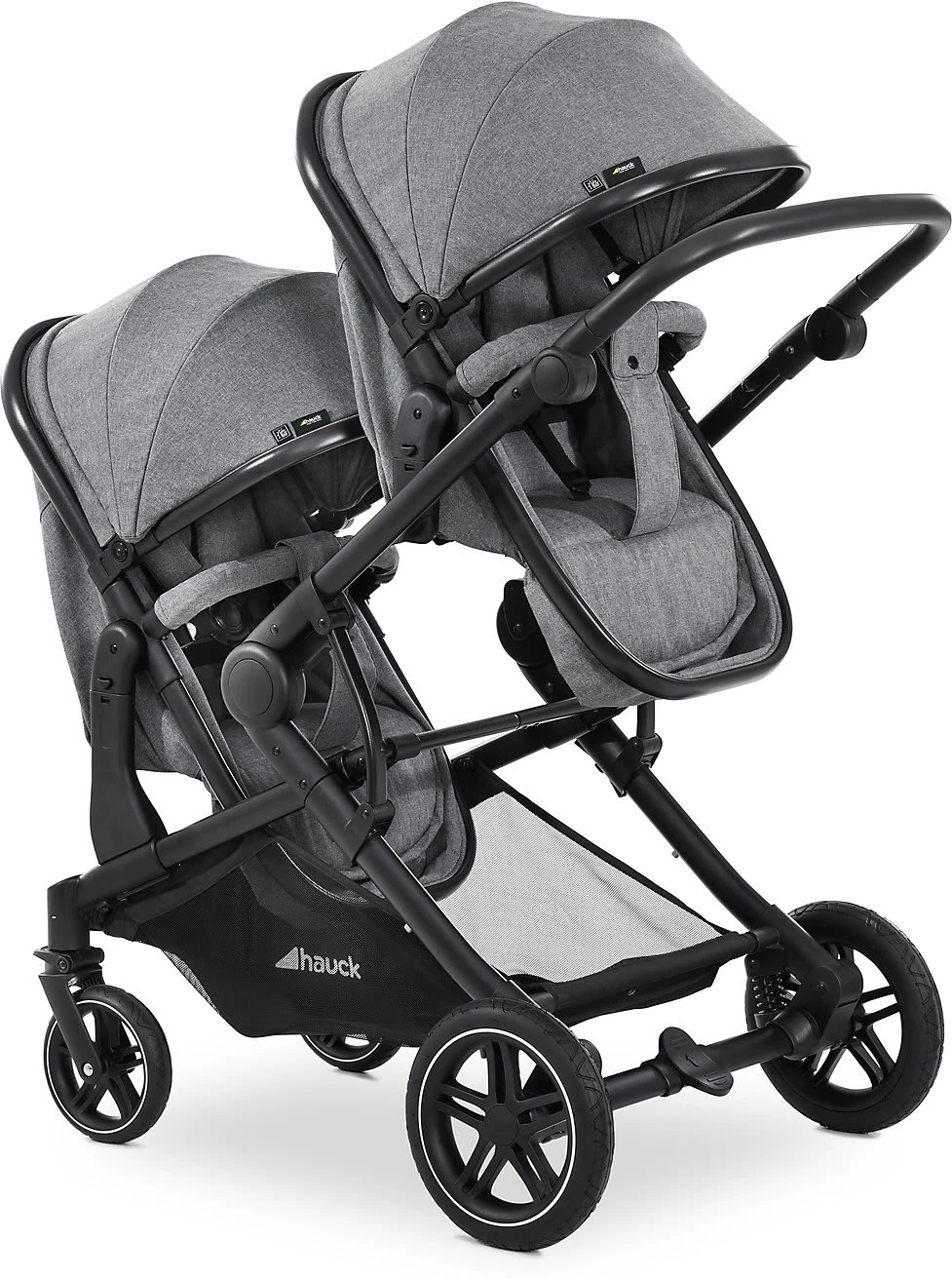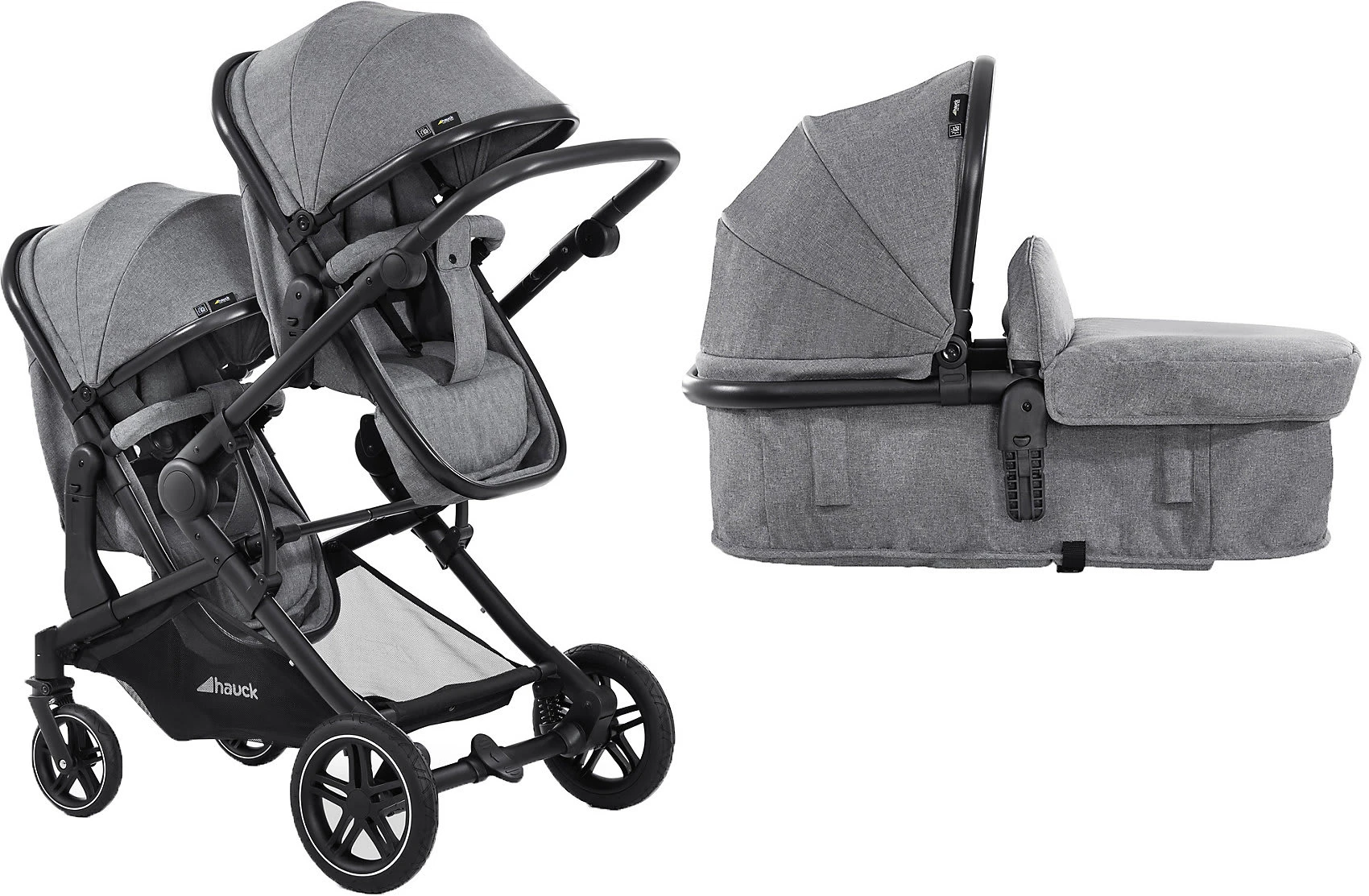 Der Zwillings- und Geschwisterwagen Atlantic Twin von Hauck kann ab Geburt der Kinder verwendet werden. Seine Babywannen lassen sich bei Bedarf in komfortable Sportsitze verwandeln und in verschiedenen Positionen auf dem Gestell befestigen. Altersempfehlung: ab Geburt Belastbarkeit: bis 36 kg, je Babywanne bis 9 kg, je Sitz bis 15 kg, Korb bis 3 kg Verwendung: für die Stadt, als Travelsystem mit Babyschale (separat erhältlich) Klappmaß: 95(L) x 64(B) x 50(H) cm Gewicht: 16,4 kg Räder: gefederte Gummiräder, Vorderrad schwenk- und feststellbar Lieferumfang: Gestell, 2 in Sportsitze umbaubare Babywannen inkl. Einlagen und Abdeckungen, 2 Verdecke, XL-Untergestellkorb, Getränkehalter Gestell: Aluminium, Schiebegriff mit höhenverstellbarer Knickfunktion (74 bis 112 cm), kompakt faltbar, Feststellbremse Tragewannen/Sportsitze: Kombi-Design, wendbare Sportsitze, 5-Punkt-Sicherheitsgurte, einhändig bis in die Liegeposition verstellbare Rückenlehnen, abnehmbare, verstellbare Vorderbügel, verlängerbare Verdecke mit UV-Schutz 50+, zu Fußsäcken kombinierbare Einlagen und Abdeckungen Sicherheit und Komfort Der multifunktionale Atlantic Twin ist der ideale Gefährte, wenn Eltern mit zwei Kindern gleichzeitig spazieren gehen möchten. Der leichte Doppelwagen begleitet den Nachwuchs ab Geburt bis ins Kindergartenalter. Zunächst liegen die Babys auf weichen Einlagen in den komfortablen Babywannen des Designs. Die großen Sonnenverdecke sind mit UV-Schutz 50+ ausgestattet. Die Winddecken bieten ihnen Schutz vor Zugluft. Sobald die Kinder selbständig sitzen können, werden die Wannen mit wenigen Handgriffen zu wendbaren Sportsitzen umgebaut. Eltern haben die Möglichkeit, sie unterschiedlich auf dem Wagen zu positionieren. So können die Sitze übereinander, mit Blickrichtung nach vorn, den Eltern zugewandt oder Rücken an Rücken angebracht werden. Es ist auch möglich, eine Wanne und einen Sitz zu kombinieren. Die Rückenlehnen der Sitze sind einhändig bis in die Liegeposition verstellbar. Die gepolsterten 5-Punkt-Gurte und die abnehmbaren Schutzbügel mit Durchrutschschutz bieten dem Nachwuchs jederzeit optimale Sicherheit. Für Ausflüge an besonders kühlen Tagen können die Einlagen und Abdeckungen der Wannen zu praktischen Fußsäcken umfunktioniert werden. In dem Getränkehalter lässt sich an warmen Tagen eine Erfrischung bereithalten. Der große Untergestellkorb nimmt Spielzeug, Accessoires und Einkäufe auf. Gestell und Fahrwerk Ein solides Aluminiumgestell bildet den Rahmen des Wagens. Im Urlaub oder unterwegs lässt sich der Wagen auf ein geringes Format zusammenfalten. Der verstellbare Schiebegriff kann an die Körpergröße der Eltern angepasst werden. Die profilierten Gummiräder meistern Kopfsteinpflaster, Asphalt und enge Supermarktgänge mühelos. Sie sind leichtgängig, pannensicher und gefedert. Für eine gute Manövrierfähigkeit sind die Vorderräder schwenkbar. Sie können bei Bedarf aber auch fixiert werden. Dank der Feststellbremse steht der Wagen nach jeder Fahrt sicher geparkt. Lieferumfang Der Lieferumfang des Atlantic Twin umfasst das Gestell, zwei zu Sportsitzen umbaubare Tragewannen mit zwei Verdecken und den Gestellkorb. Auch der Getränkehalter ist inklusive. Besonderheiten Die Erweiterung zu einem flexiblen Travel-System ist möglich: Ergänzend zum Atlantic Twin sind die Babyschalen Comfort Fix oder Select Baby erhältlich. Diese können anstelle der Wannen auf dem Fahrgestell des Atlantic Twin befestigt werden. Die benötigten Adapter sind separat erhältlich.