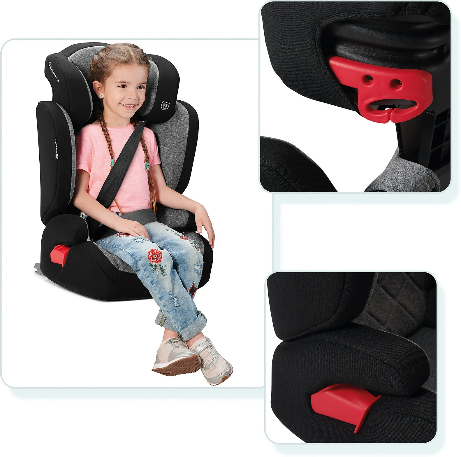 Der Auto-Kindersitz XPAND von KINDERKRAFT sorgt unter anderem mit verstärktem Seitenschutz und verstärkter Kopfstütze dafür, dass Ihr Kind während der Fahrt geschützt ist. Er eignet sich über einen langen Alterszeitraum hinweg. Im Alter von ungefähr dreieinhalb bis zwölf Jahre findet Ihr Nachwuchs darin bestens Platz. Der Sitz kann mit den Isofix-Konnektoren befestigt werden oder auch mit dem Gurtsystem des Autos. Eine komfortable Polsterung und ergonomische Armlehnen sorgen für Bequemlichkeit auch während längerer Fahrten. Mit nur einer Handbewegung werden die Höhe der Kopfstütze und die Breite der Seitenverkleidungen eingestellt. Dadurch wird der Sitz um acht Zentimeter höher und um fünf Zentimeter breiter. Für die Sicherheit des Kindes stehen vier Positionen zur Wahl.