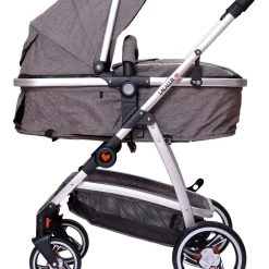 Dieser Kombi-Kinderwagen ist für Babys und Kleinkinder zwischen 0-36 Monaten und bis zu 15kg geeignet. Sehr leicht und dennoch stabil, einfach klappbar und mühelos montiert, bewährt er sich auf jedem Gelände und macht Spaziergänge zum unbeschwerten Vergnügen für Eltern und Kind. Verschiedene Sitzpositionen, von liegend bis aufrecht sitzend, flexibel in 2 Fahrtrichtungen, garantieren den besten Fahrkomfort für kleine Weltentdecker. Alle Räder verfügen über eine integrierte Federung, zusätzlich ist die Hinterachse stark gefedert, um Ihr Kleines vor Erschütterungen zu schützen. Der Kombikinderwagen lässt sich einhändig zusammenklappen. Dazu einfach den Knopf am Schiebebügel drücken und mit dem Daumen entriegeln. Mit sanftem Druck nach unten lässt sich der Kinderwagen nun einfach zusammenfalten. Für den Transport im Auto unablässig. Ein 5-Punkt-Gurt ist wie ein schützendes Netz, das Ihr Kind sicher und trotzdem sanft im Sitz hält. Das Gurtsystem erlaubt außerdem eine individuelle Anpassung an den Körper des Kindes und sorgt für einen besonders guten und sicheren Sitz. Die Bremsen der Hinterräder werden durch eine Berührung mit dem Fuß aktiviert. Wenn es weitergehen kann, brauchen Sie den Hebel an der Hinterradachse nur mit dem Fuß wieder anzuheben; Und für einen angenehmen Luftaustausch sorgt ein großes Belüftungsfenster aus Netzstoff, das sich bei Bedarf einfach verschließen lässt. So ist der Schlafkorb bei jedem Wetter atmungsaktiv bei gleichzeitigem Schutz vor Regen und Kälte. Und last but not least präsentiert sich der Kinderwagen auf den Straßen unglaublich elegant. Perfekt für stilbewusste Eltern mit dem süßesten Kind der Welt!