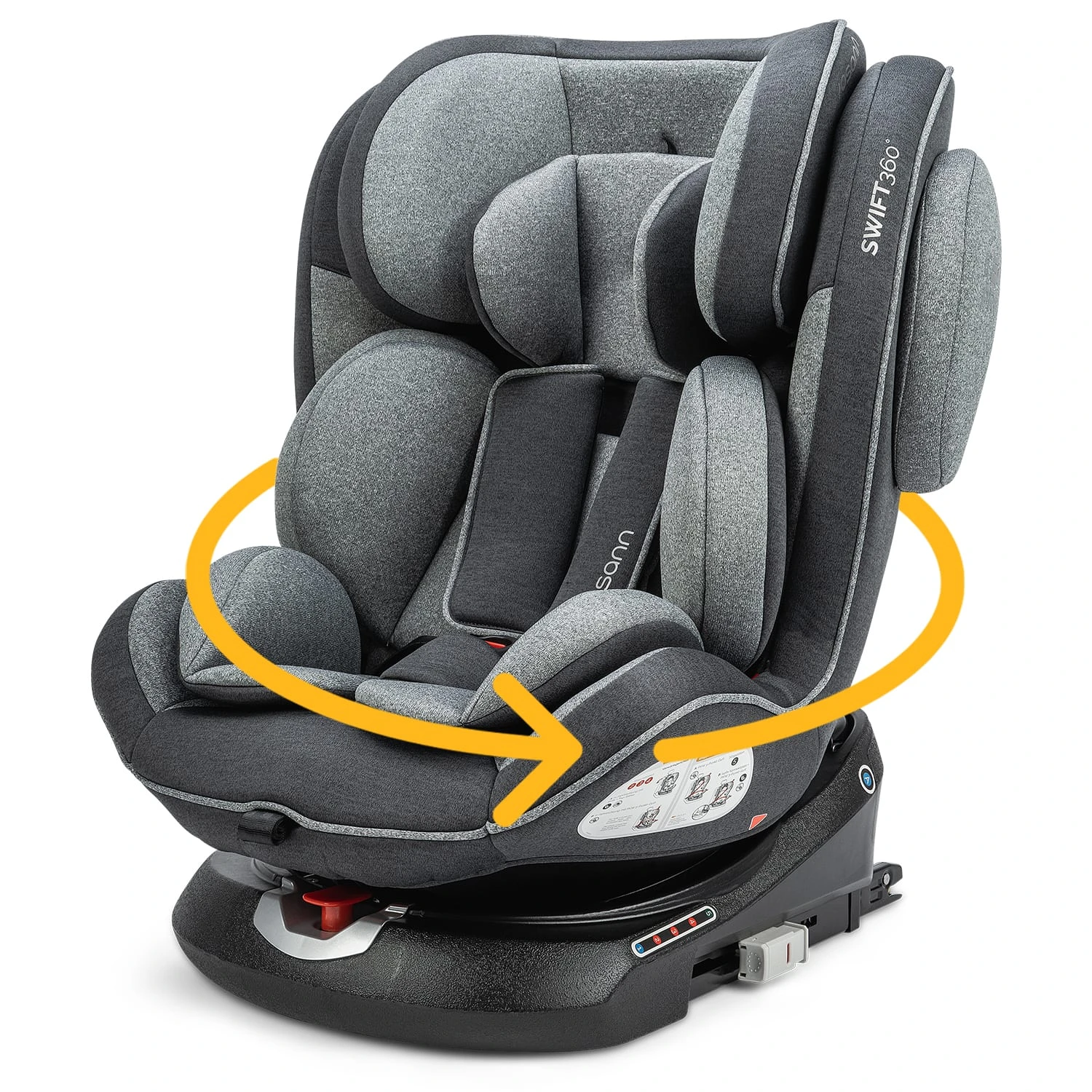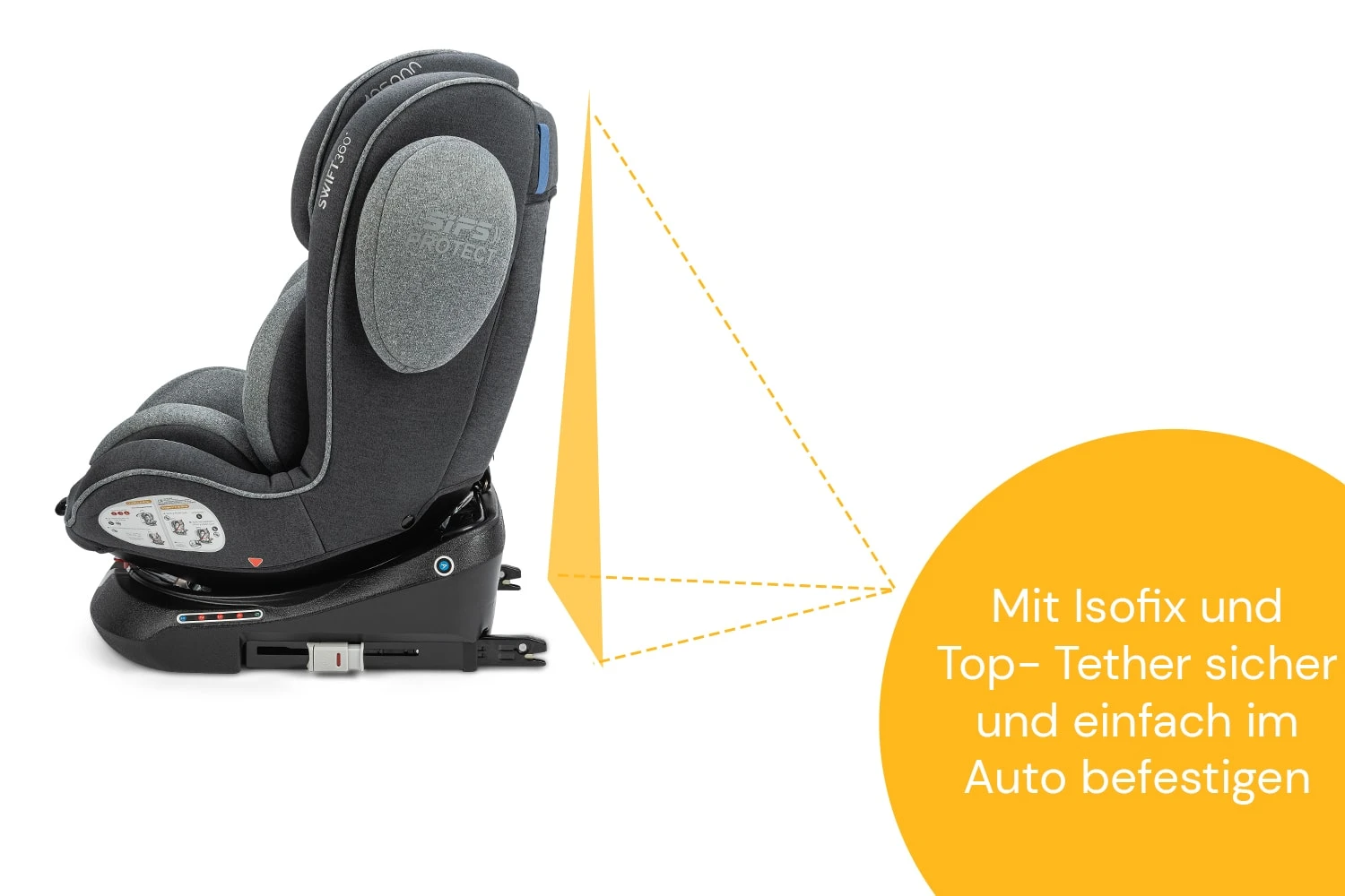 Unser Swift360 ist der erste drehbare Kinderautositz seiner Klasse und überzeugt auf voller Länge. Die 360° Drehfunktion unterstützt Eltern nicht nur beim Einsteigen, sondern ermöglicht auch einen einfachen Wechsel von der Reboard-Position in Fahrtrichtung, was frühestens ab einem Körpergewicht von 9 kg möglich ist. Experten empfehlen allerdings, den Nachwuchs bis zu einem Alter von 24 Monaten rückwärts fahren zu lassen – kein Problem für den Swift360!